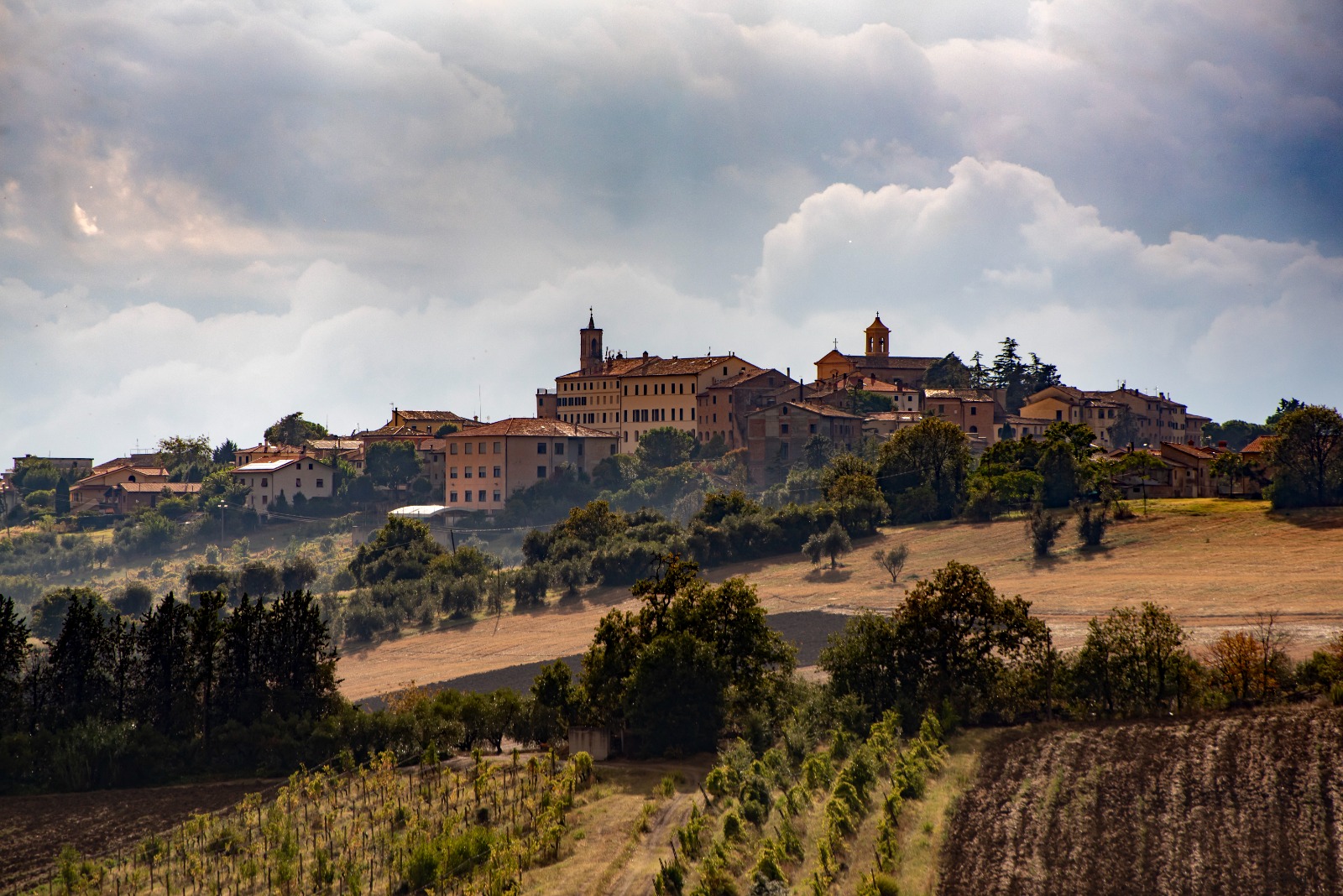 Il centro storico è racchiuso da un’imponente cinta muraria pentagonale con alte cortine a scarpata, la cui caratteristica più singolare è il Camminamento di Ronda “La Scarpa”: un percorso coperto di 300 metri, risalente al Seicento, che corre lungo tutto il perimetro del borgo. Dai suoi finestroni si gode un panorama straordinario che spazia dai Monti Sibillini al Conero fino al Monte San Bartolo, abbracciando il tipico paesaggio ondulato delle colline marchigiane. I torrioni panoramici medievali – Stupor Mundi, Costanza, Teodorico e Federico Barbarossa – scandiscono il percorso, ciascuno legato a figure storiche che hanno segnato il territorio.